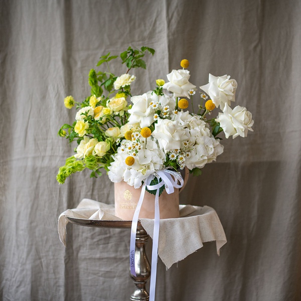 "Tender Hugs" is the perfect floral arrangement for your dearest. White roses, daisies, and light yellow accents create an atmosphere of comfort, love, and gratitude.